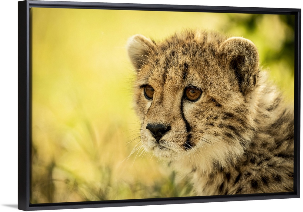 <p>Close-up of cheetah cub (Acinonyx jubatus) sitting staring left, Cottar's 1920s Safari Camp, Maasai Mara National Reserve; Kenya</p>