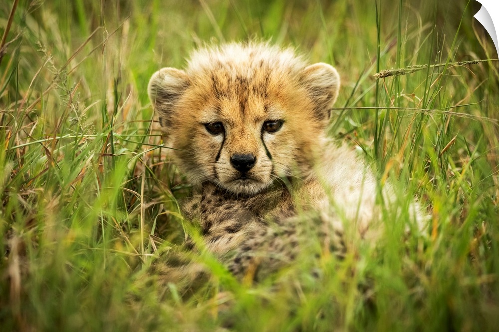 <p>Cheetah cub (acinonyx jubatus) lies in grass eyeing camera, Grumeti Serengeti tented camp, Serengeti national park, Tanzania.</p>