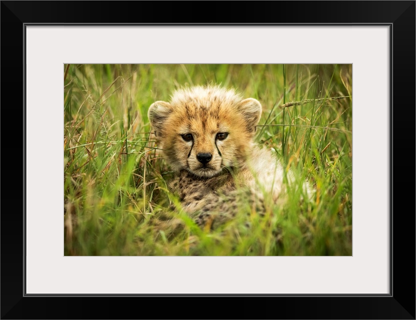 <p>Cheetah cub (acinonyx jubatus) lies in grass eyeing camera, Grumeti Serengeti tented camp, Serengeti national park, Tanzania.</p>
