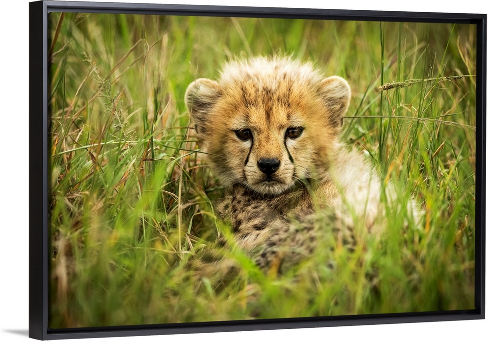 <p>Cheetah cub (acinonyx jubatus) lies in grass eyeing camera, Grumeti Serengeti tented camp, Serengeti national park, Tanzania.</p>