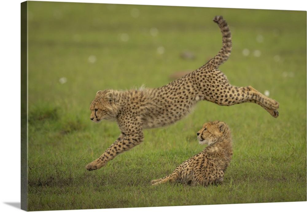 <p>Cheetah cub (Acinonyx jubatus) jumps over another lying down in Maasai Mara National Reserve; Narok, Masai Mara, Kenya.</p>