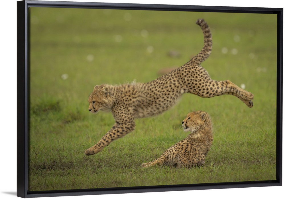 <p>Cheetah cub (Acinonyx jubatus) jumps over another lying down in Maasai Mara National Reserve; Narok, Masai Mara, Kenya.</p>