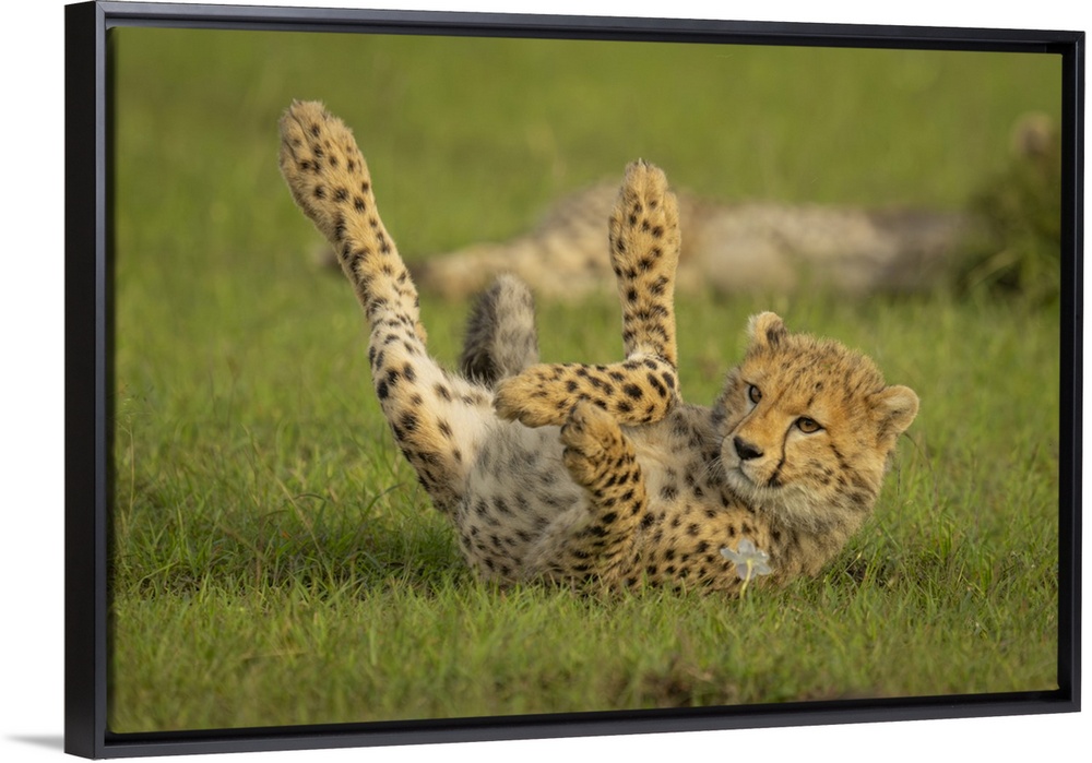 <p>Cheetah cub (Acinonyx jubatus) lies on back in grass in Maasai Mara National Reserve; Narok, Masai Mara, Kenya.</p>