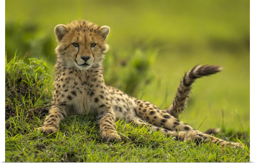 <p>Cheetah cub (Acinonyx jubatus) lies on mound flicking tail in Maasai Mara National Reserve; Narok, Masai Mara, Kenya.</p>