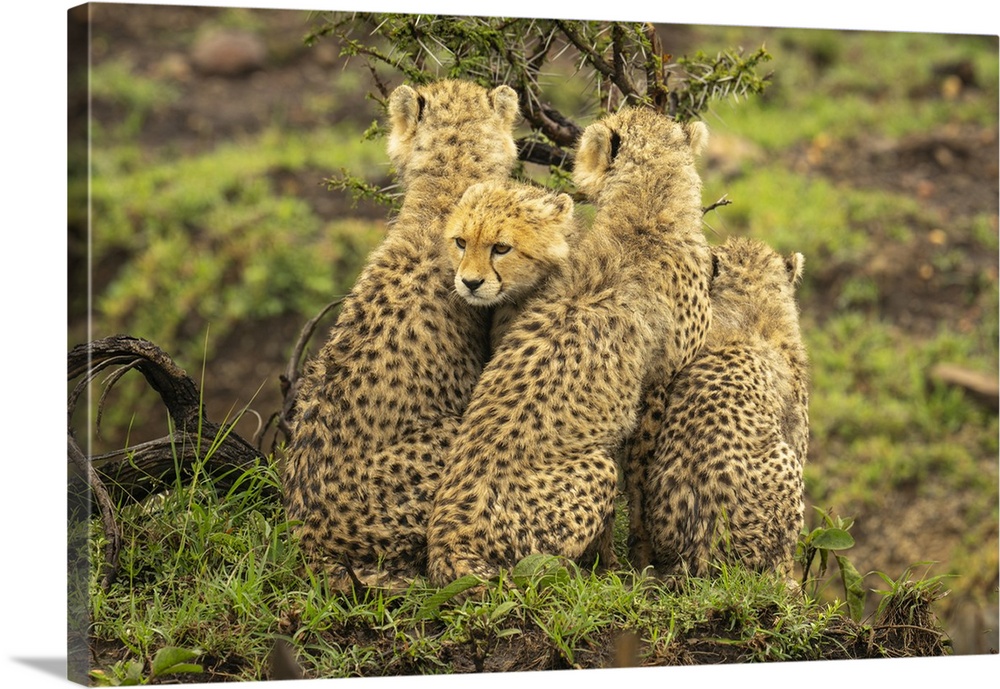 <p>Cheetah cub (Acinonyx jubatus) sits squeezed between three others in Maasai Mara National Reserve; Narok, Masai Mara, Kenya.</p>
