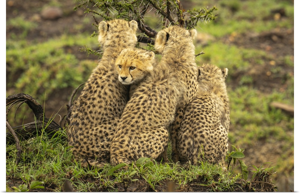 <p>Cheetah cub (Acinonyx jubatus) sits squeezed between three others in Maasai Mara National Reserve; Narok, Masai Mara, Kenya.</p>