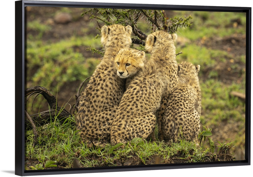 <p>Cheetah cub (Acinonyx jubatus) sits squeezed between three others in Maasai Mara National Reserve; Narok, Masai Mara, Kenya.</p>