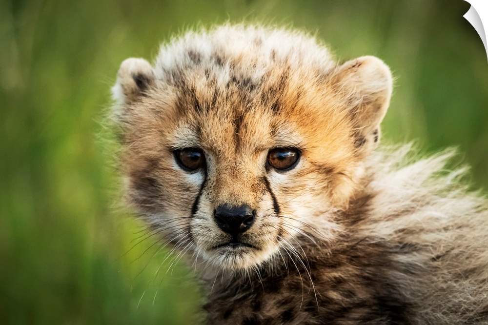 <p>Cheetah cub (acinonyx jubatus) sitting watching camera, Grumeti Serengeti tented camp, Serengeti national park, Tanzania.</p>
