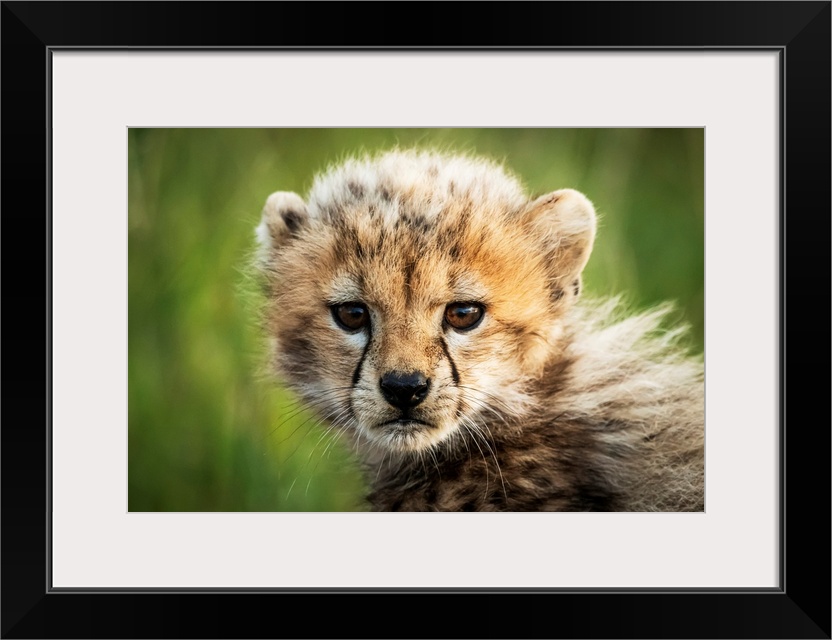 <p>Cheetah cub (acinonyx jubatus) sitting watching camera, Grumeti Serengeti tented camp, Serengeti national park, Tanzania.</p>