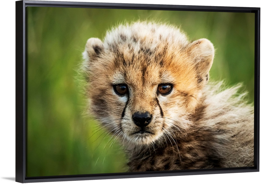 <p>Cheetah cub (acinonyx jubatus) sitting watching camera, Grumeti Serengeti tented camp, Serengeti national park, Tanzania.</p>
