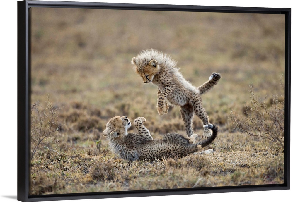 <p>Tanzania, Ngorongoro Conservation Area, Ndutu Plains, Cheetah Cubs (Acinonyx jubatas) playing on savanna</p>