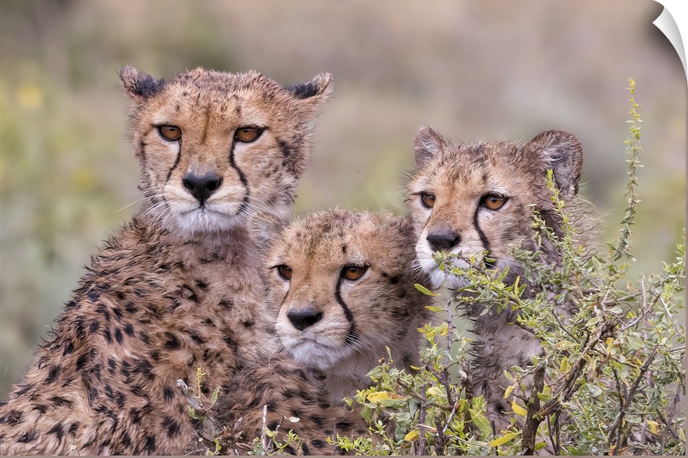 <p>Cheetah cubs trying to hide behind bush, but too curious to stay in hiding. Serengeti, Tanzania, Africa.</p>