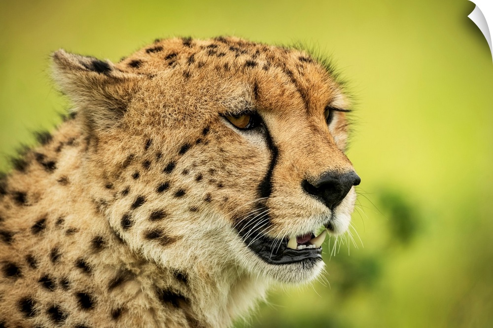 <p>Close-up of cheetah (acinonyx jubatus) face against blurred background, Klein's camp, Serengeti national park, Tanzania.</p>