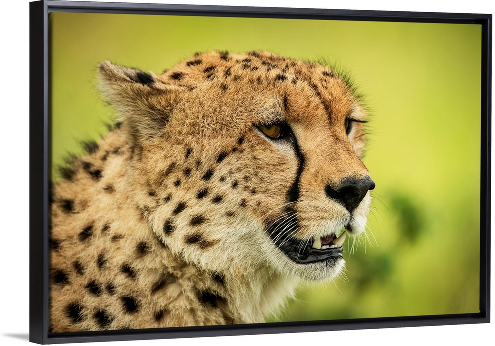 <p>Close-up of cheetah (acinonyx jubatus) face against blurred background, Klein's camp, Serengeti national park, Tanzania.</p>