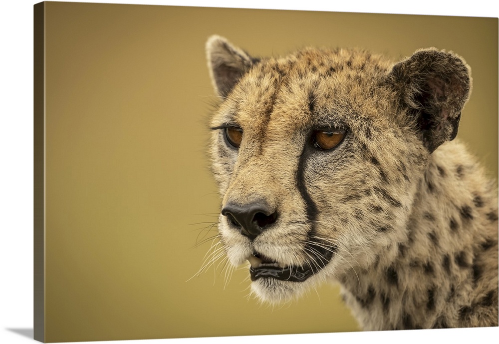 <p>A cheetah (acinonyx jubatus) is staring into the distance in a close-up of her face and neck. She has brown fur covered with black spots, and the background bokeh is a smooth and creamy gold, serengti, Tanzania.</p>