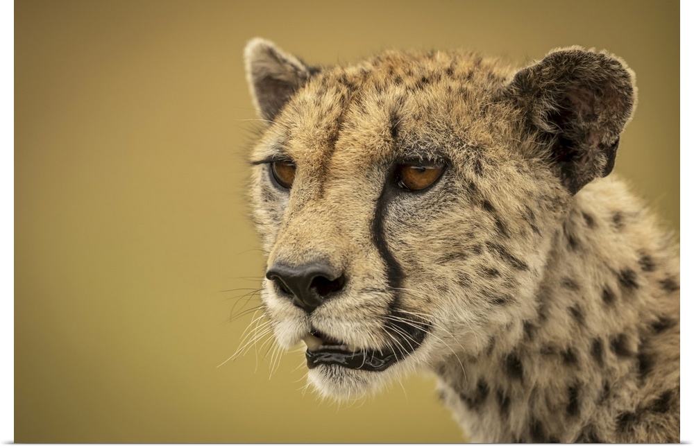 <p>A cheetah (acinonyx jubatus) is staring into the distance in a close-up of her face and neck. She has brown fur covered with black spots, and the background bokeh is a smooth and creamy gold, serengti, Tanzania.</p>