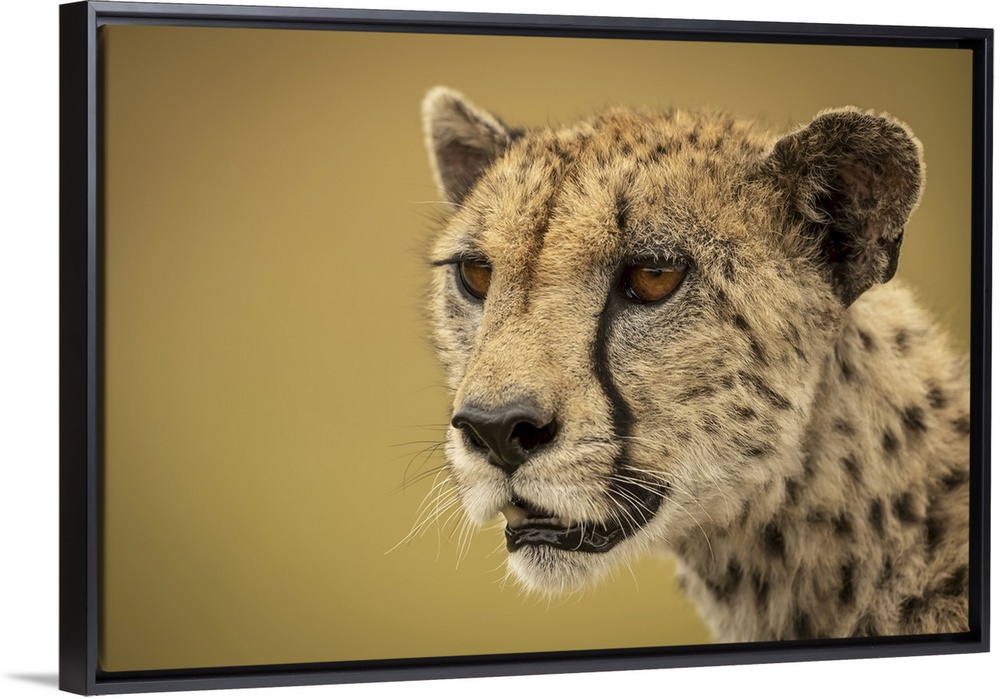 <p>A cheetah (acinonyx jubatus) is staring into the distance in a close-up of her face and neck. She has brown fur covered with black spots, and the background bokeh is a smooth and creamy gold, serengti, Tanzania.</p>