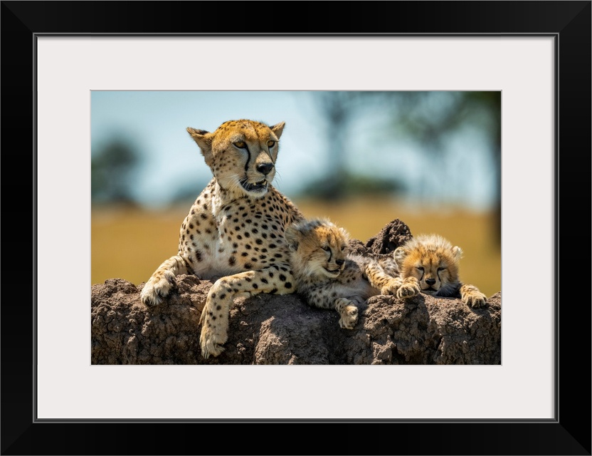 <p>Cheetah (acinonyx jubatus) lies on mound with sleepy cubs, Grumeti Serengeti tented camp, Serengeti national park, Tanzania.</p>