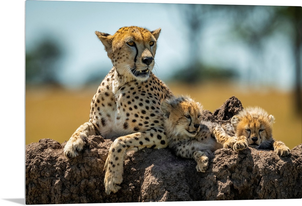 <p>Cheetah (acinonyx jubatus) lies on mound with sleepy cubs, Grumeti Serengeti tented camp, Serengeti national park, Tanzania.</p>