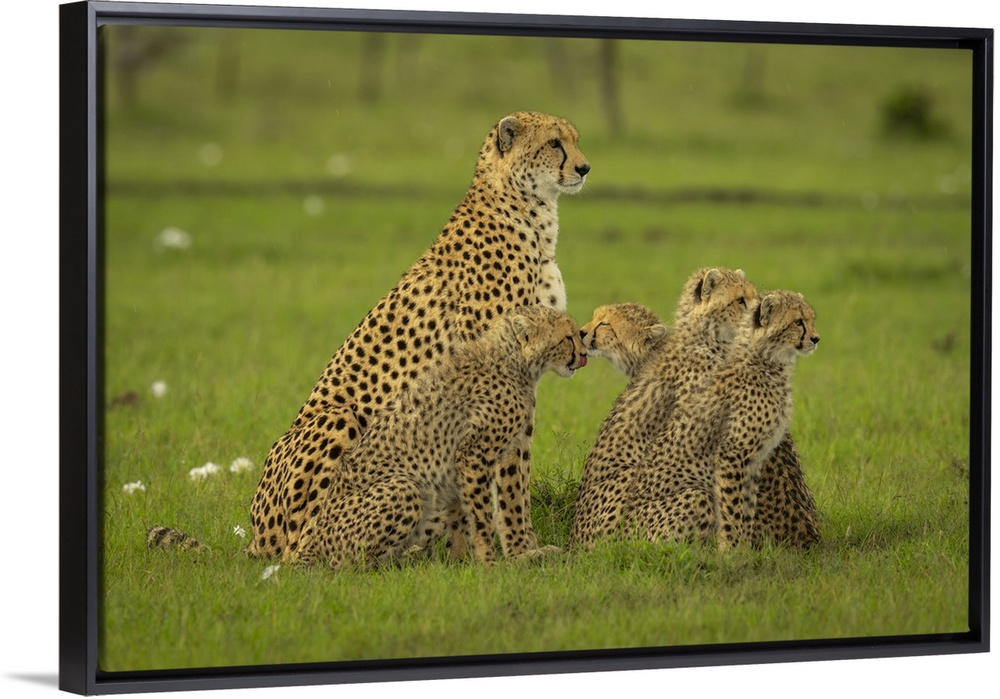 <p>Cheetah (Acinonyx jubatus) sits on grass beside four cubs in Maasai Mara National Reserve; Narok, Masai Mara, Kenya.</p>