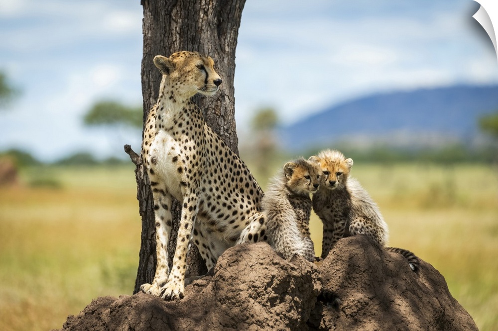 <p>Cheetah (Acinonyx jubatus) sits on termite mound by cubs, Grumeti Serengeti Tented Camp, Serengeti National Park; Tanzania</p>