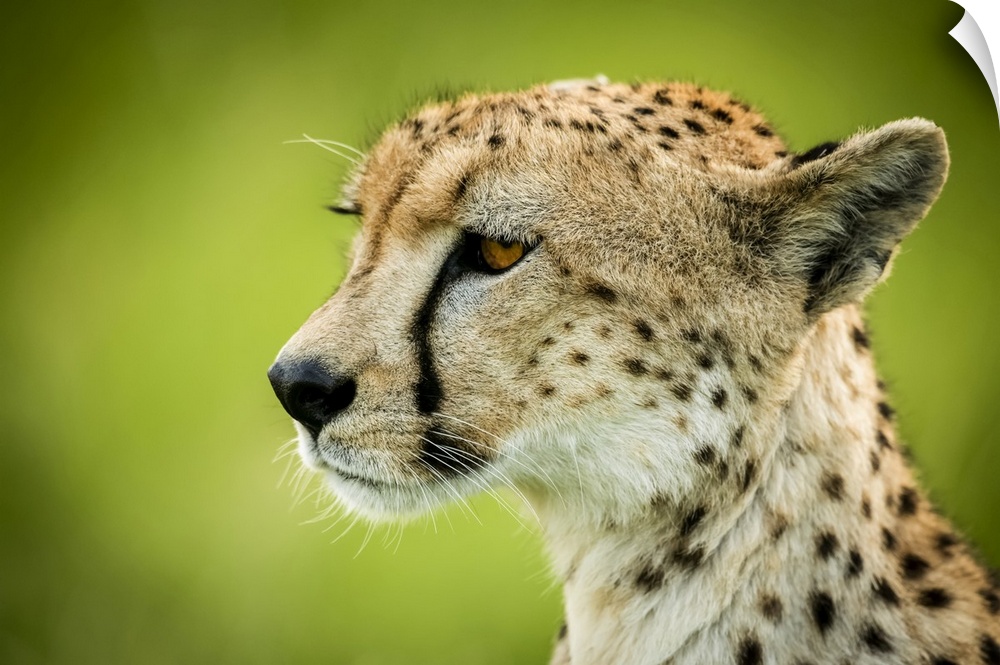 <p>Close-up of cheetah (Acinonyx jubatus) sitting with green bokeh, Grumeti Serengeti Tented Camp, Serengeti National Park; Tanzania</p>