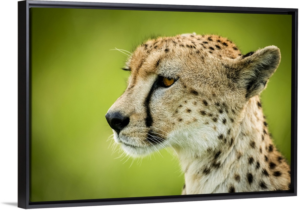 <p>Close-up of cheetah (Acinonyx jubatus) sitting with green bokeh, Grumeti Serengeti Tented Camp, Serengeti National Park; Tanzania</p>