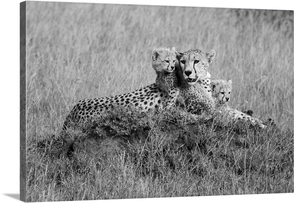 <p>Cheetahs (acinonyx jubatus), mother animal with young cubs resting on a mound in the grassy savanna at the Grumeti game reserve, Tanzania.</p>