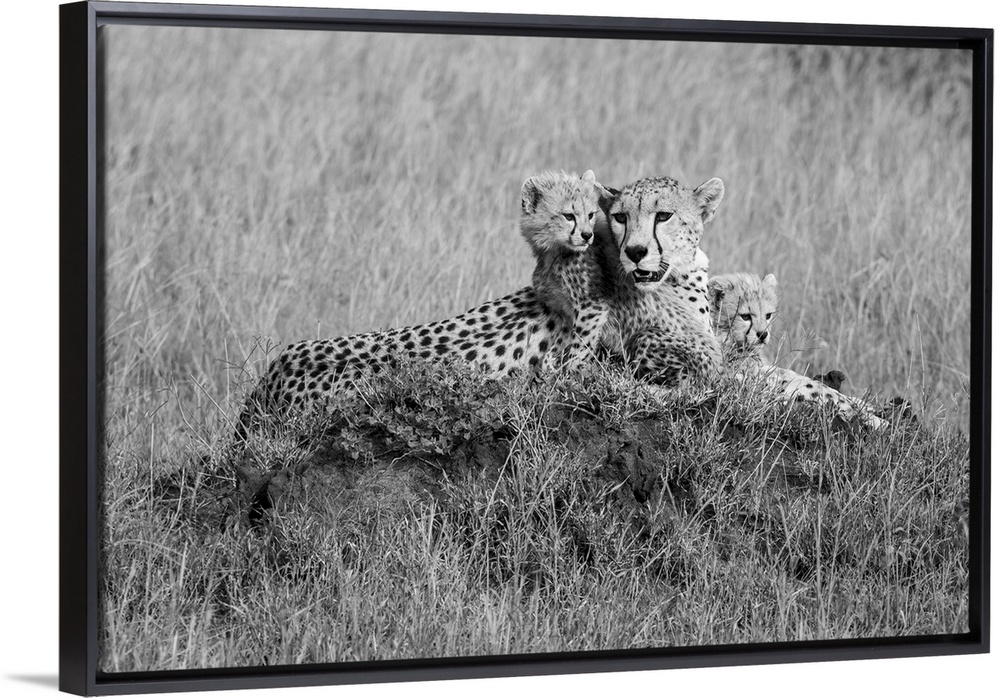 <p>Cheetahs (acinonyx jubatus), mother animal with young cubs resting on a mound in the grassy savanna at the Grumeti game reserve, Tanzania.</p>