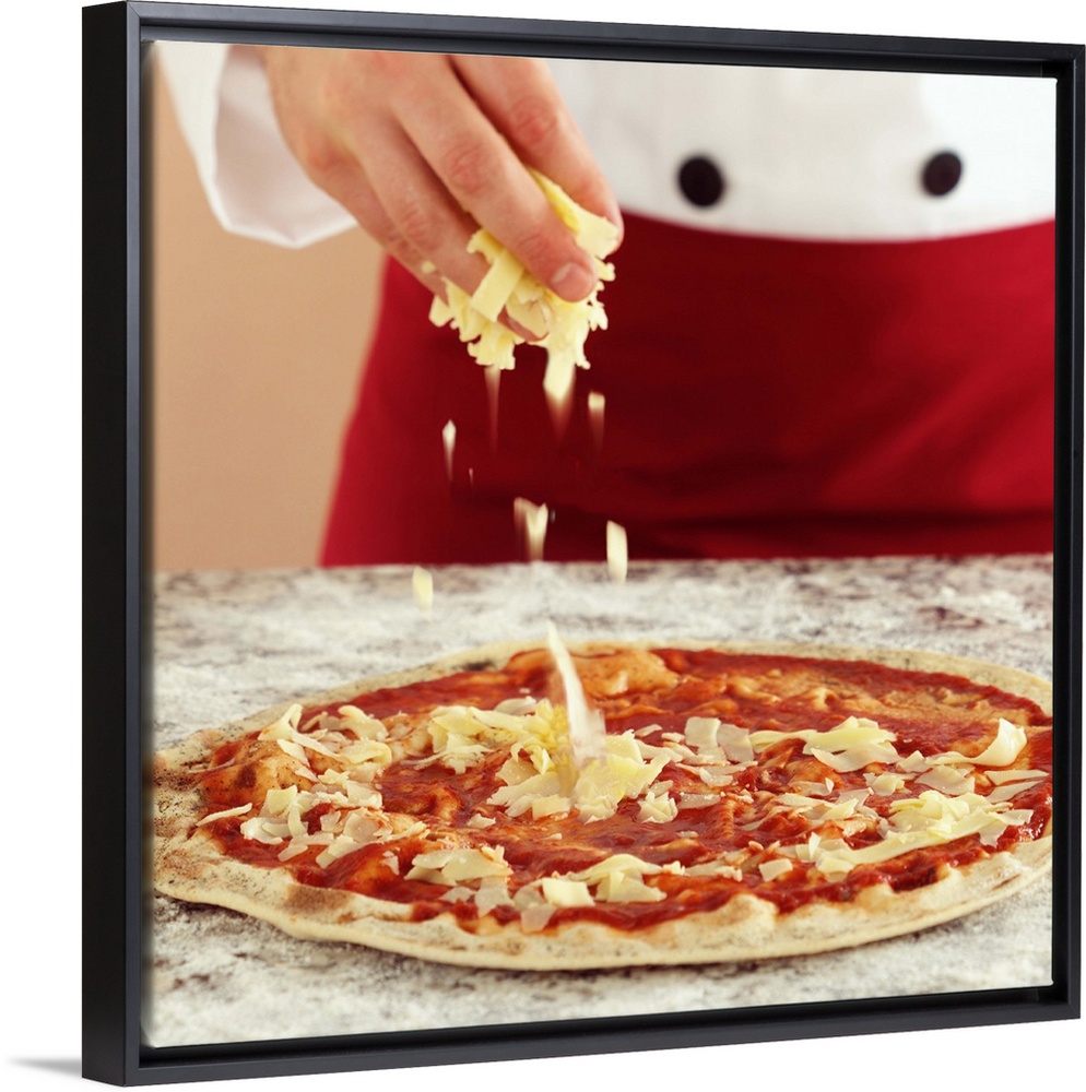 <p>Close-up of a chef preparing a pizza. Hands sprinkling cheese on pizza topped with mozzarella and tomato sauce. Granite workbench.</p>