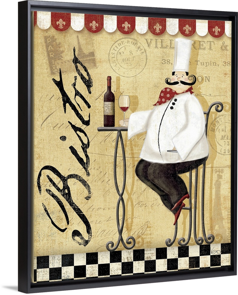<p>Decorative artwork perfect for the kitchen of a large chef sitting at a tall table with a bottle of wine and glass placed on it. The word Bistro is written vertically on the left side of the print.</p>