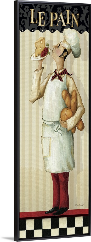 <p>This vertical decorative accent for the kitchen or boutique shows a chef standing against a striped background on a checkered floor. The chef is inspecting a plate of cheese, cradling several loafs of bread in his arms, and the French word for bread on the top of the artwork.</p>