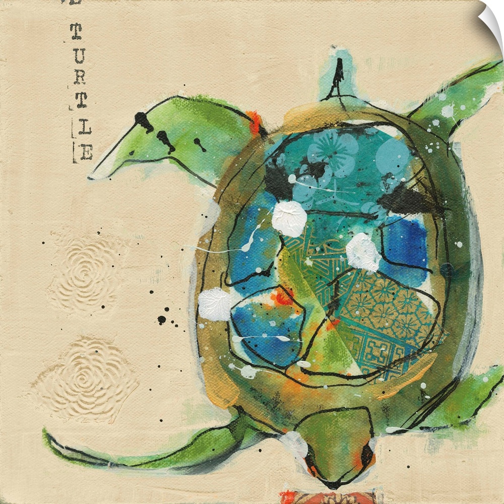<p>Square abstract painting of a turtle with designs on its shell and the word "Turtle" stamped on the top.</p>