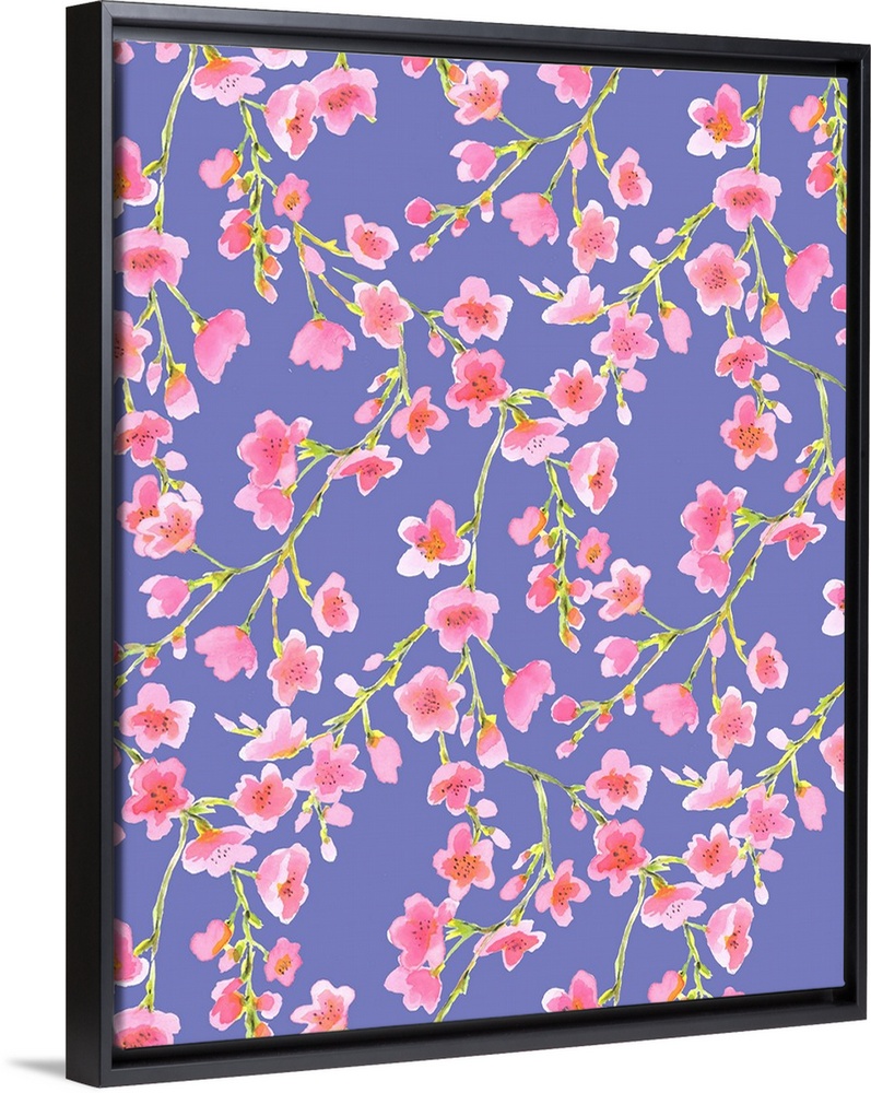 <p>A painting of light pink flowers on vines against a purple background.</p>