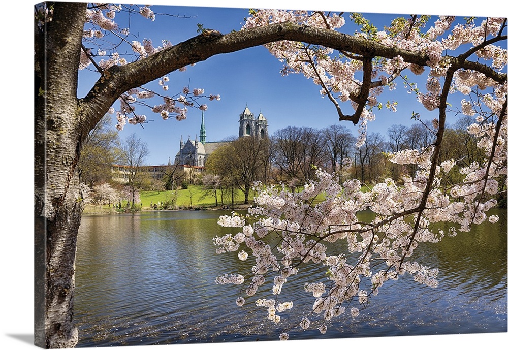<p>Cherry Blossom in Branch Brook Park with the Cathedral of the Sacred Heart in the Background, Newark, Essex County, New Jersey, USA</p>