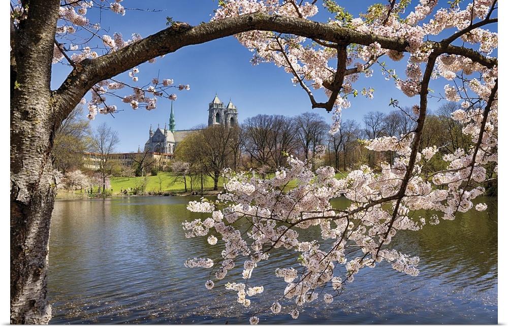 <p>Cherry Blossom in Branch Brook Park with the Cathedral of the Sacred Heart in the Background, Newark, Essex County, New Jersey, USA</p>