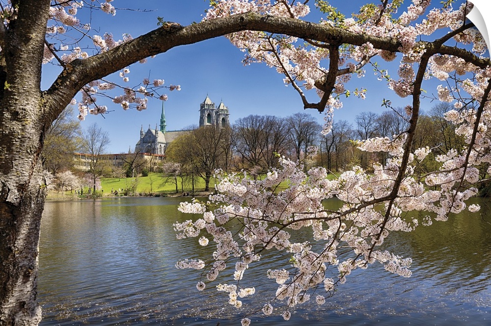 <p>Cherry Blossom in Branch Brook Park with the Cathedral of the Sacred Heart in the Background, Newark, Essex County, New Jersey, USA</p>