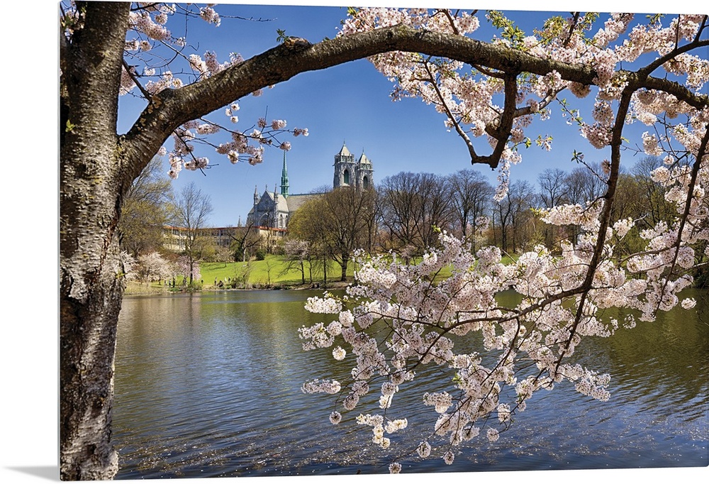 <p>Cherry Blossom in Branch Brook Park with the Cathedral of the Sacred Heart in the Background, Newark, Essex County, New Jersey, USA</p>