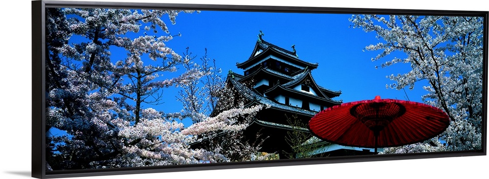 <p>Beautiful trees are pictured surrounding a Japanese castle with a red umbrella near the bottom right hand side of the photograph.</p>