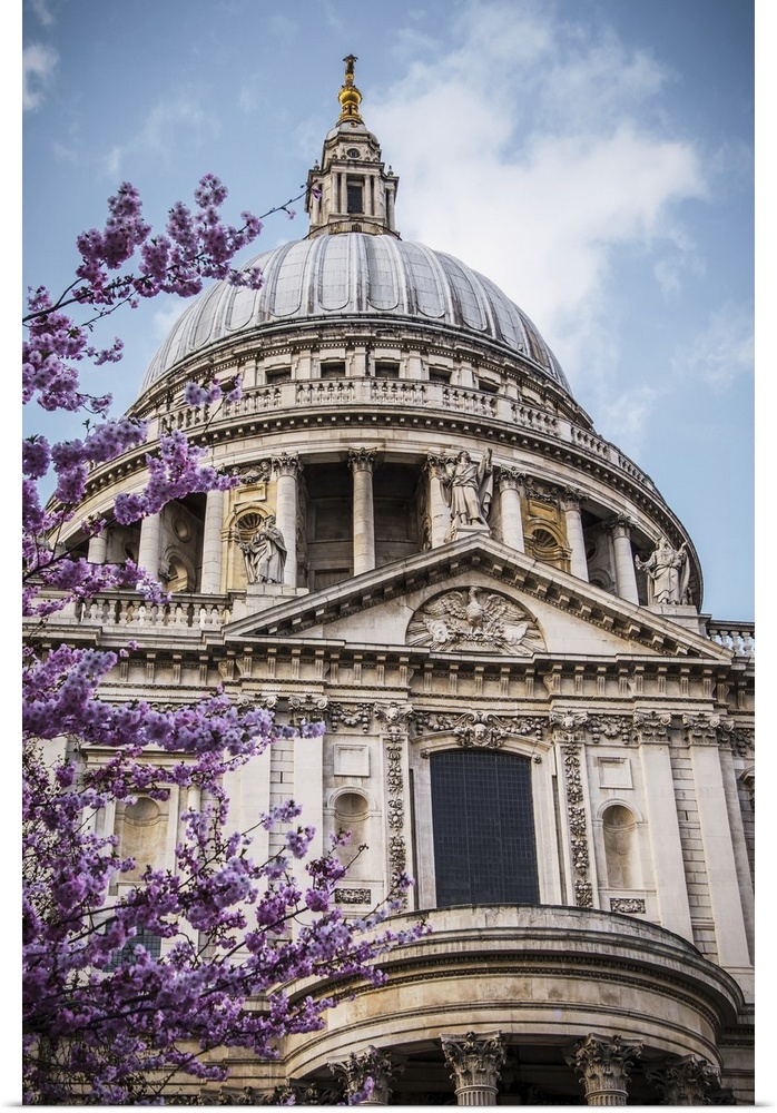 <p>A Cherry Blossom Tree Blooms Beautiful Pink Flowers In Front Of St. Paul's Cathedral; London, England</p>