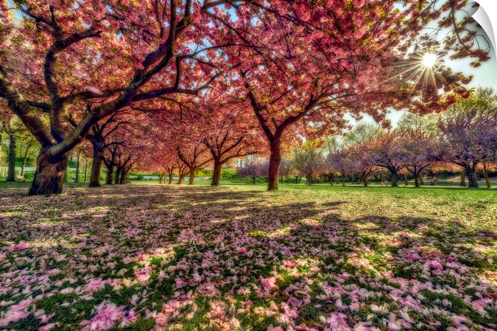 <p>Beauty of Cherry blossom trees (Prunus kanzan) in full bloom with petals littering the ground in a park; Brooklyn, New York, United States of America</p>