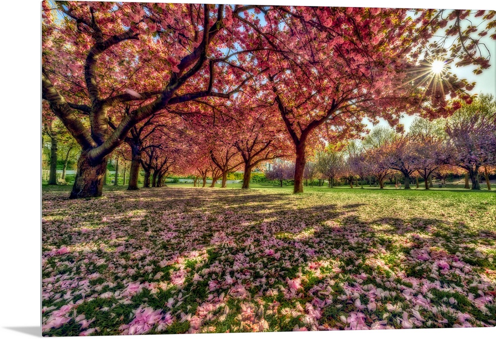 <p>Beauty of Cherry blossom trees (Prunus kanzan) in full bloom with petals littering the ground in a park; Brooklyn, New York, United States of America</p>