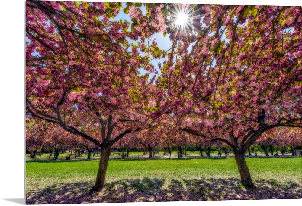 <p>Beauty of Cherry blossom trees (Prunus kanzan) in full bloom with petals littering the ground in a park; Brooklyn, New York, United States of America</p>