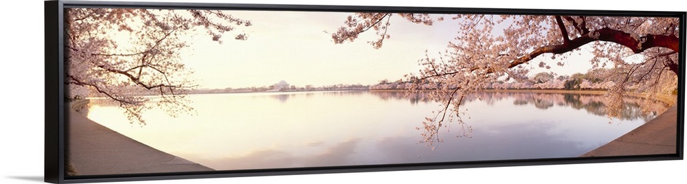 <p>Wide angle view of a body of water that is lined with cherry blossom trees.</p>
