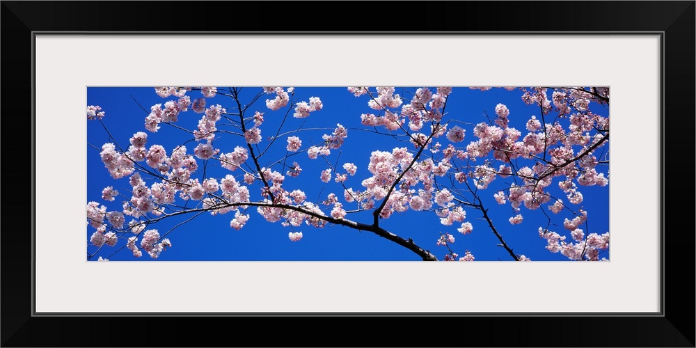 <p>A panoramic canvas that is a close up of blossoms on a branch in the spring against a clear sky.</p>