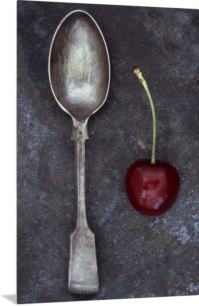 <p>Antique tarnished silver teaspoon lying next to single dark red cherry with stalk on tarnished metal</p>