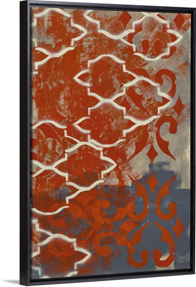 <p>Contemporary abstract painting created with grey and red hues and repeating shapes.</p>