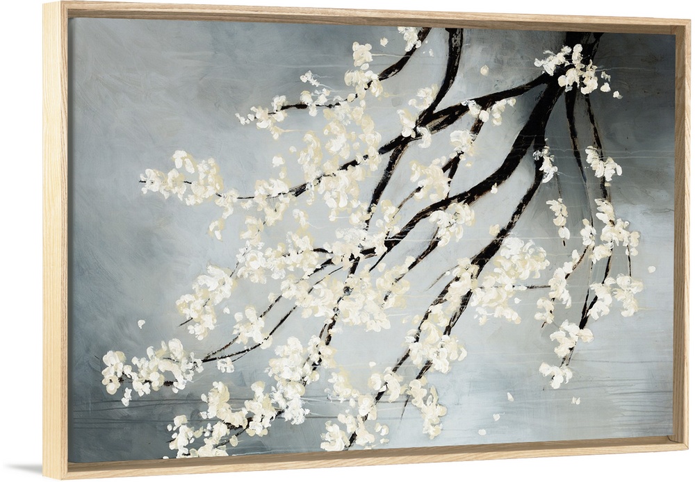<p>Contemporary drawing of blooming white flowers on the dark branches of a cherry tree hanging down from the top.</p>