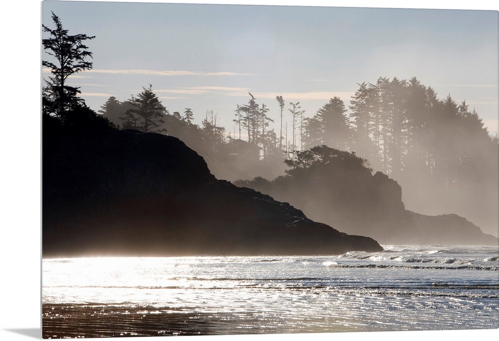 <p>Mist rises of the sea against the silhouettes of rocks and trees in this shore line photograph taken in the morning.</p>