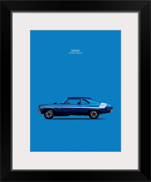 <p>Photograph of a blue Chevy Nova 350 Yenko Deuce 70 printed on a blue background</p>